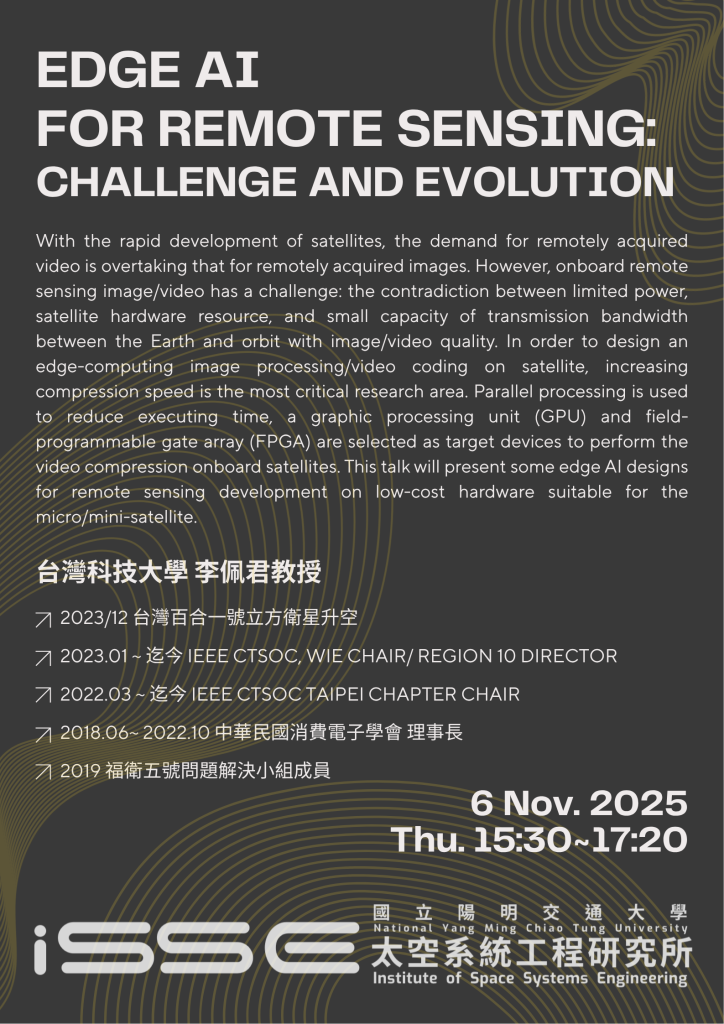 李教授將深入分享她在衛星遙測、AI邊緣運算及衛星任務實務上的豐富經驗,並介紹台灣百合一號立方衛星的發射與實踐,內容精彩可期,歡迎有興趣的同學與師長踴躍參加!